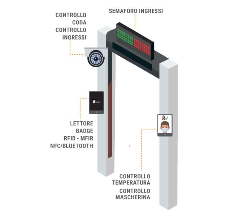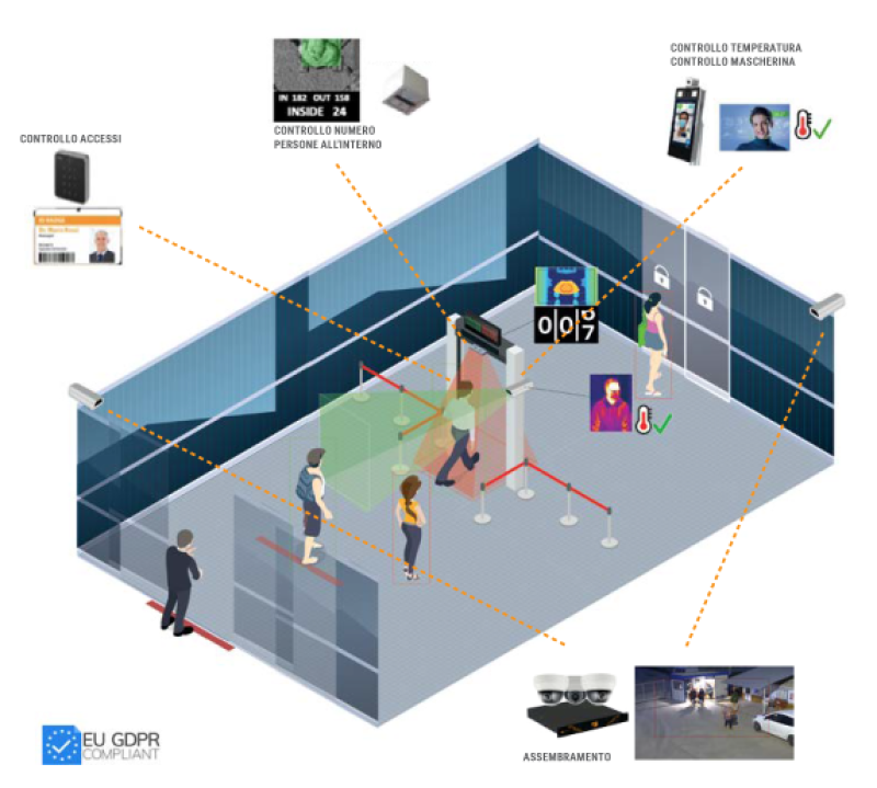 • conteggiare la presenza di persone con la possibilità di gestire in maniera automatica il numero chiuso di ingresso/uscita e riconoscerli in relazione alla temperatura corporea