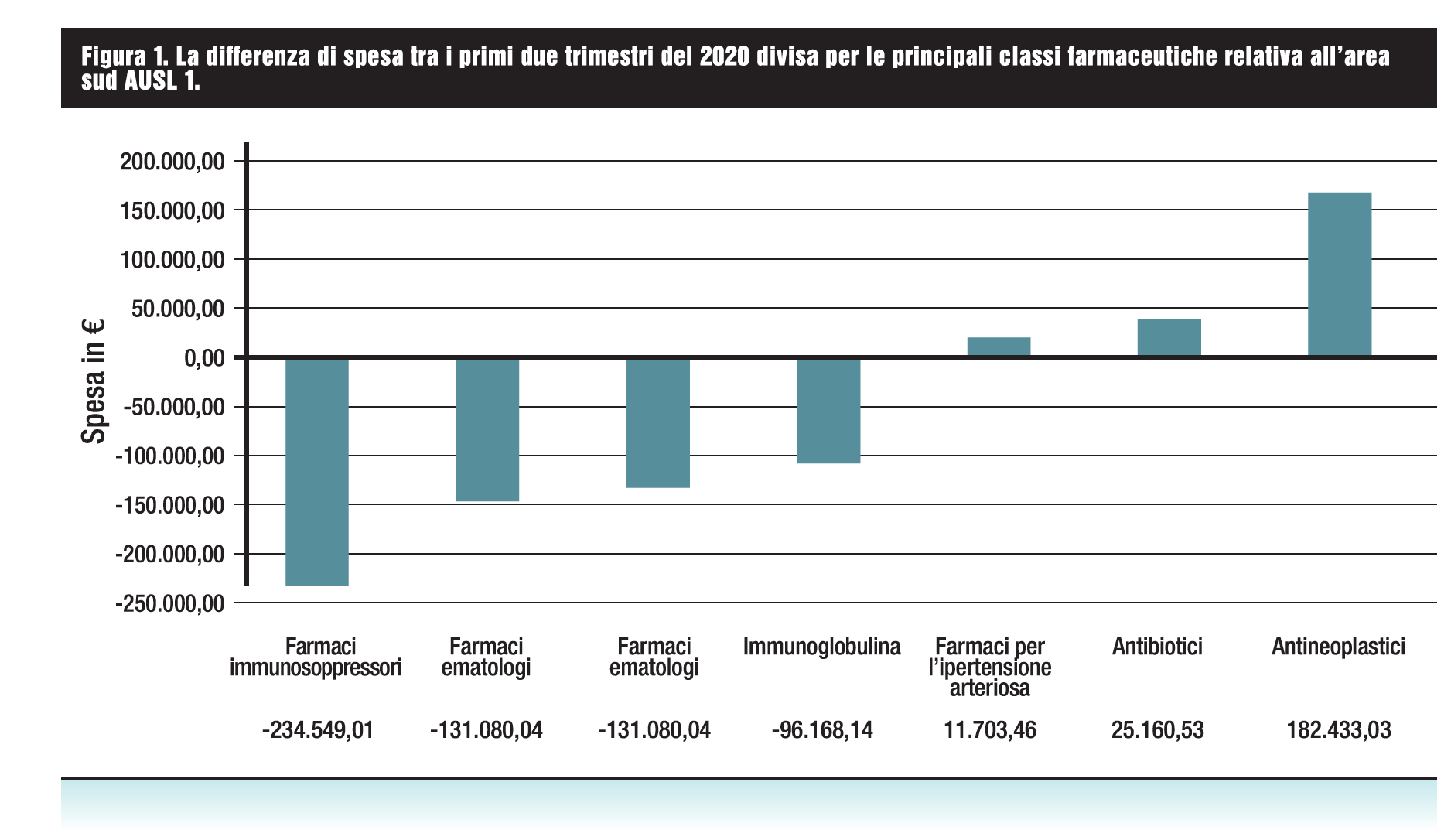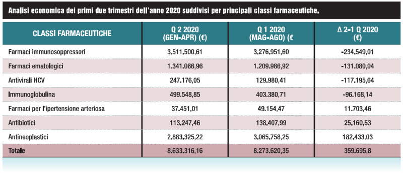 L’analisi dei primi due trimestri del 2020 (Figura 1) mostra un immediato effetto positivo di questa nuova organizzazione logistica con una maggiore appropriatezza derivante dalla collaborazione clinica in team di tutti gli operatori sanitari. Nel primo trimestre 2020, prima dell’organizzazione logistica per le principali classi farmaceutiche distribuite in DD, la spesa è stata di € 8.633.316,16, mentre nel secondo trimestre la spesa è scesa a € 8.273.620,35 con un risparmio di circa € 359.695,81 (Tabella 1).